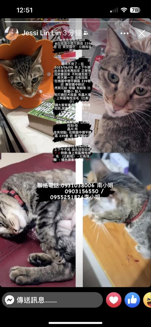 貓咪不見了,在2023/06/05 早上下午跑出去後沒有再回來 正常情況她會回來 不知道怎麼了 昨天第一次 沒有回來